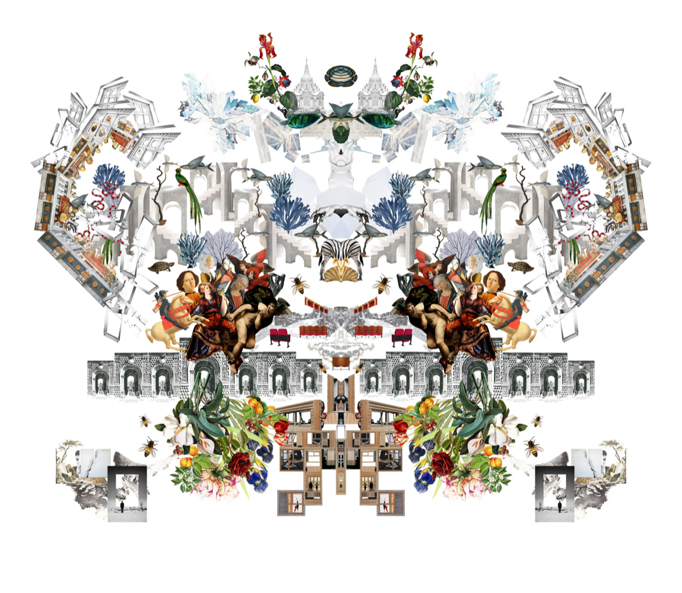 I learned the technique of the concept collage at EMBT Miralles-Tagliabue Studio in Barcelona in 2016. The method, initially used by architect Enric Miralles consists in using the freedom of mixing, cutting, layering all the elements of a determinate project (could it be a urbanism project, a building, a book cover,an imaginary world, an idea, a theory, a performance... ) and in a melting pot of dimensions create a synthetic/synesthetic image that could suggest an entire mood and net of interdisciplinary connections, all in the same image. The result is an image which is a conceptual synthesis and an aesthetic statement itself.